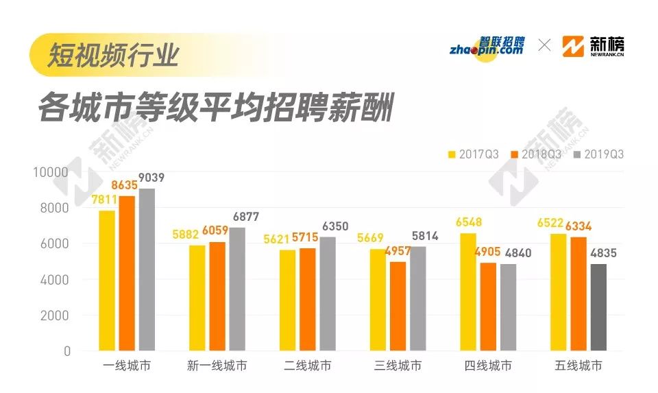 2019Q3数据显示,一线城市企业给短视频人才开出的平均招聘薪酬超过9k(注:k表示千)。