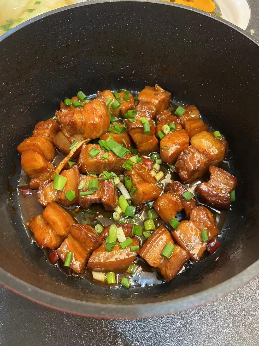 准备五花肉 :将五花肉切成2-3厘米见方的块,放入沸水中焯水,去除杂质和腥味,捞出沥干。炒糖色 :在锅中放少许油,加入冰糖,小火慢慢加热,待糖融化并呈现出琥珀色时,迅速放入焯过水的五花肉,翻炒均匀,让每块肉都裹上糖色。调味入锅 :加入生姜片、葱段、八角和桂皮,翻炒出香味后,倒入适量的料酒和酱油,继续翻炒,让肉块均匀上色。炖煮入味 :加入足够的清水,水量要没过肉块,加入适量的盐,转小火炖煮约40分钟,直到肉质软烂,汤汁浓稠。收汁上桌 :最后大火收汁,让红烧肉更加浓郁,盛出后撒上葱花,增添色彩与香气。